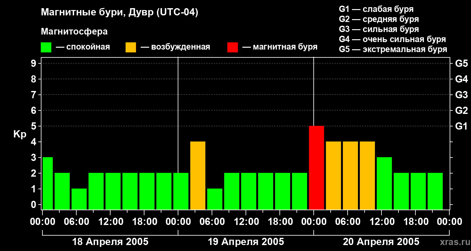 Изменения геомагнитного индекса Kp с 18 по 20 апреля 2005 года для средних широт
