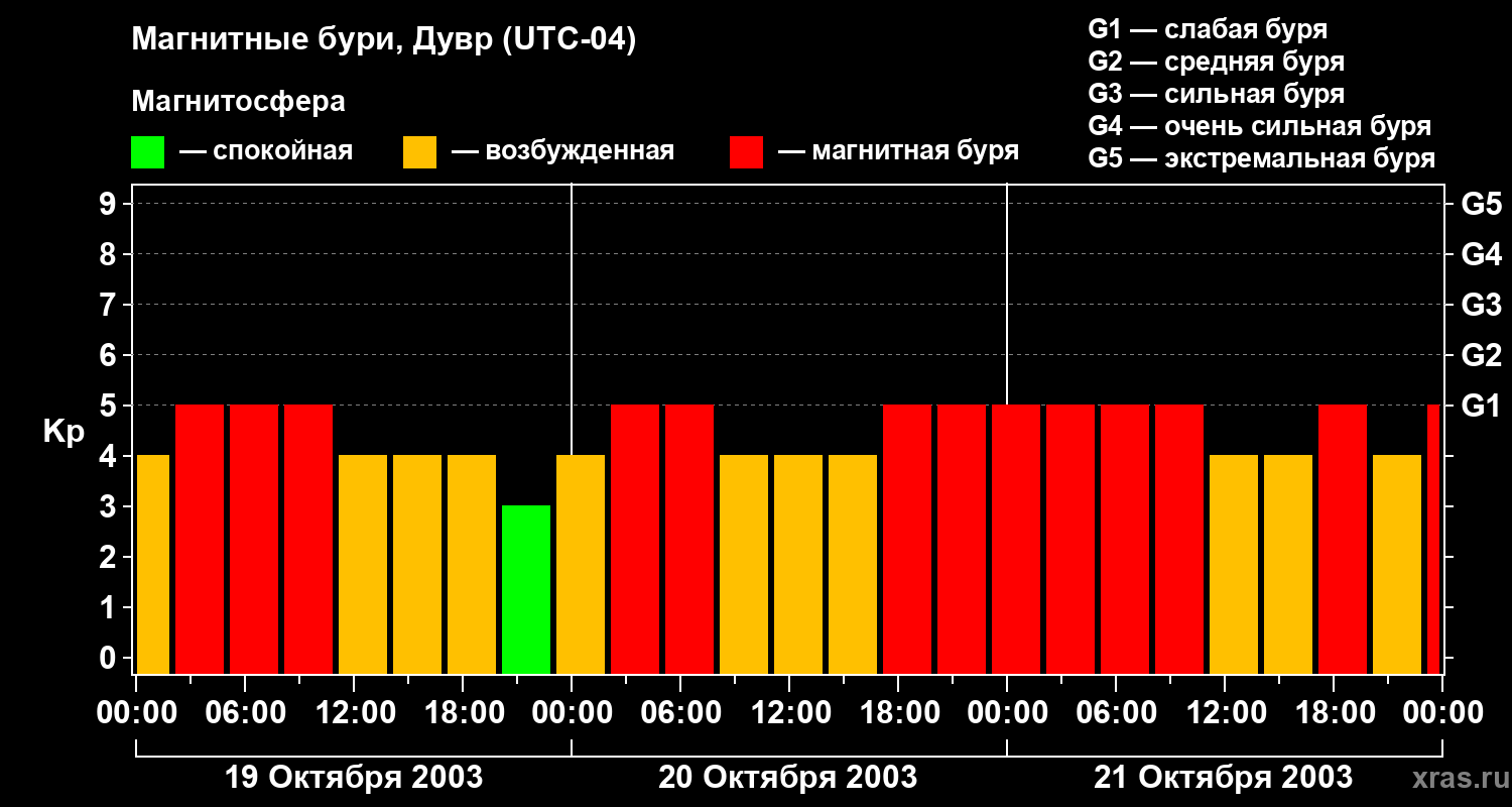 Изменения геомагнитного индекса Kp с 19 по 21 октября 2003 года для средних широт