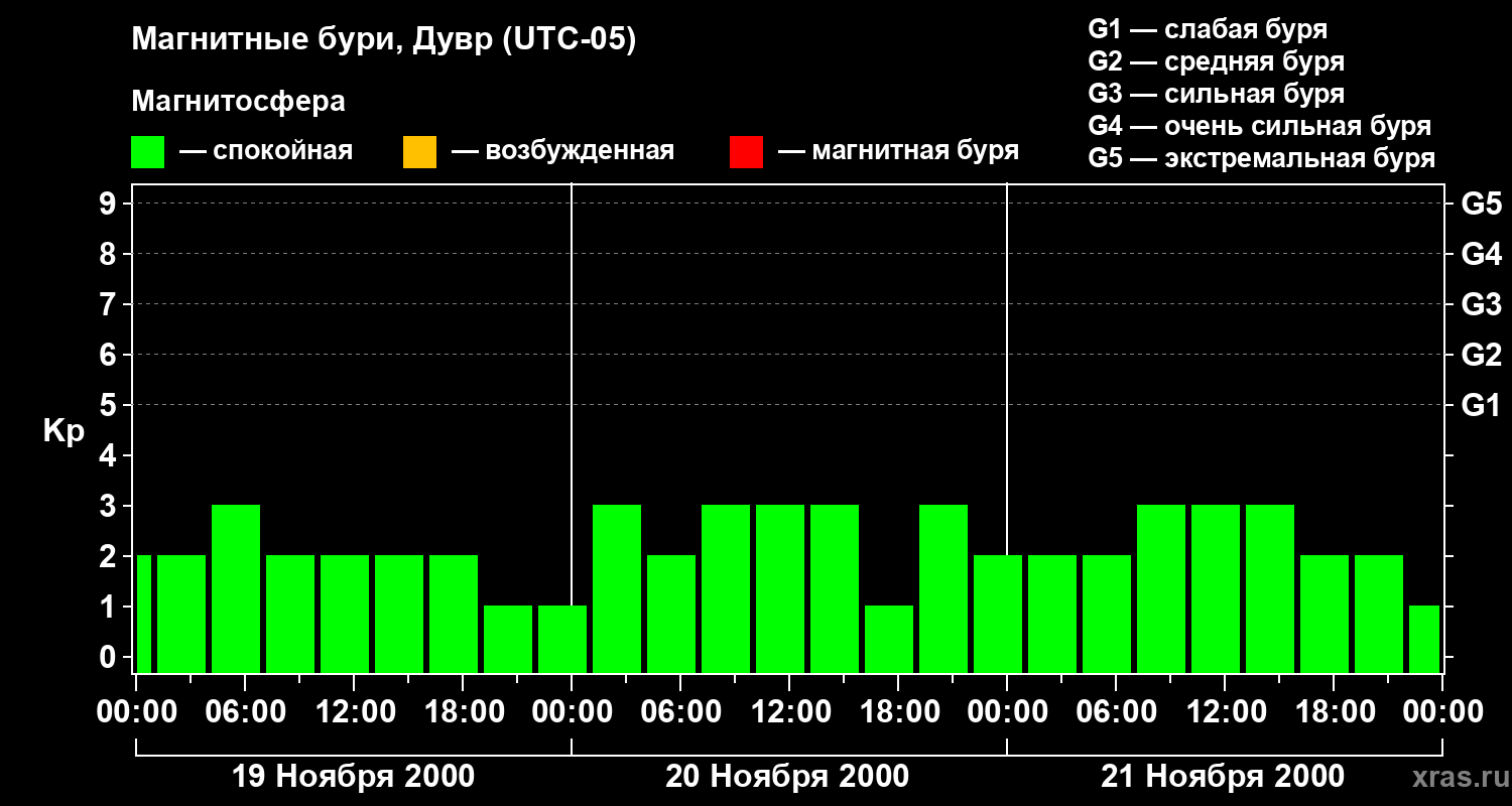 Изменения геомагнитного индекса Kp с 19 по 21 ноября 2000 года для средних широт