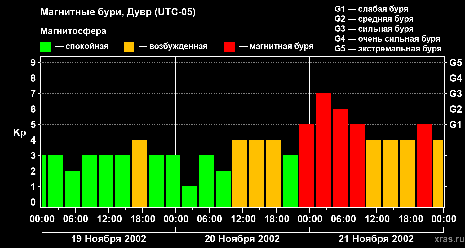 Изменения геомагнитного индекса Kp с 19 по 21 ноября 2002 года для средних широт