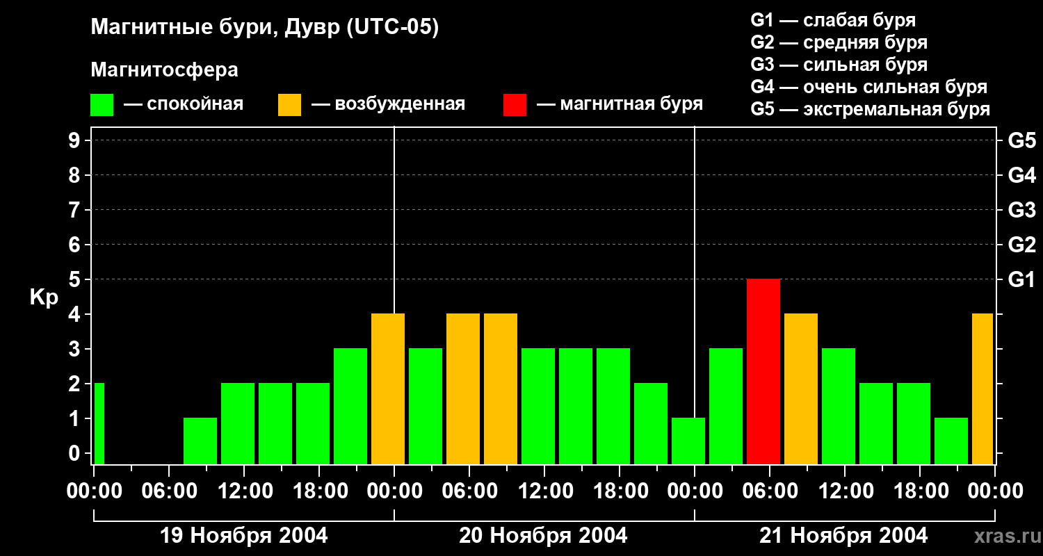 Изменения геомагнитного индекса Kp с 19 по 21 ноября 2004 года для средних широт