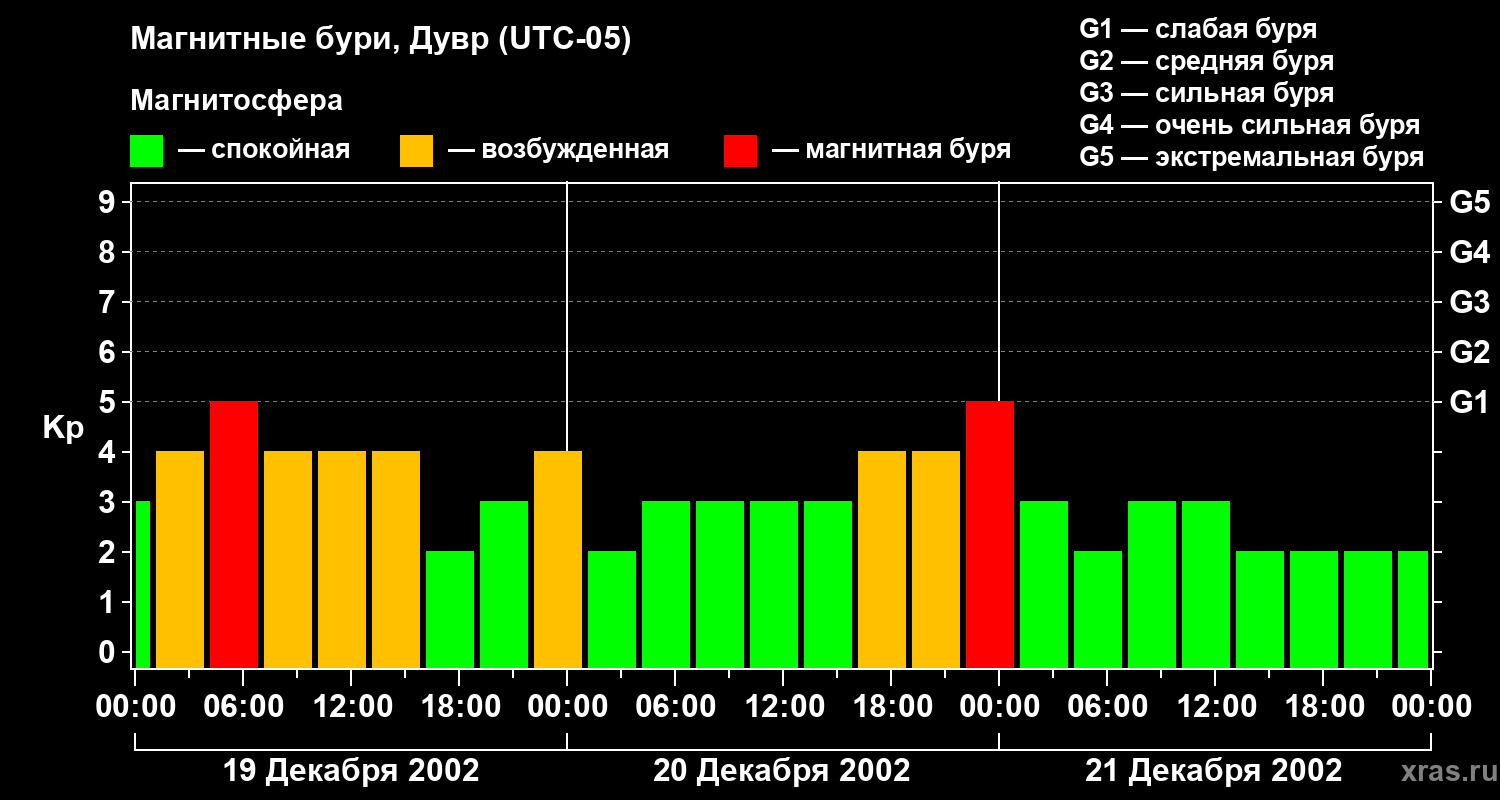 Изменения геомагнитного индекса Kp с 19 по 21 декабря 2002 года для средних широт