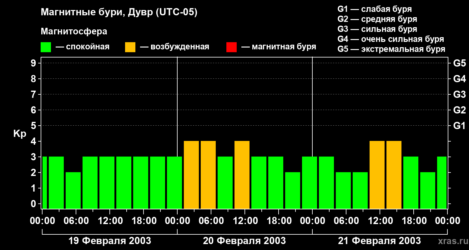 Изменения геомагнитного индекса Kp с 19 по 21 февраля 2003 года для средних широт