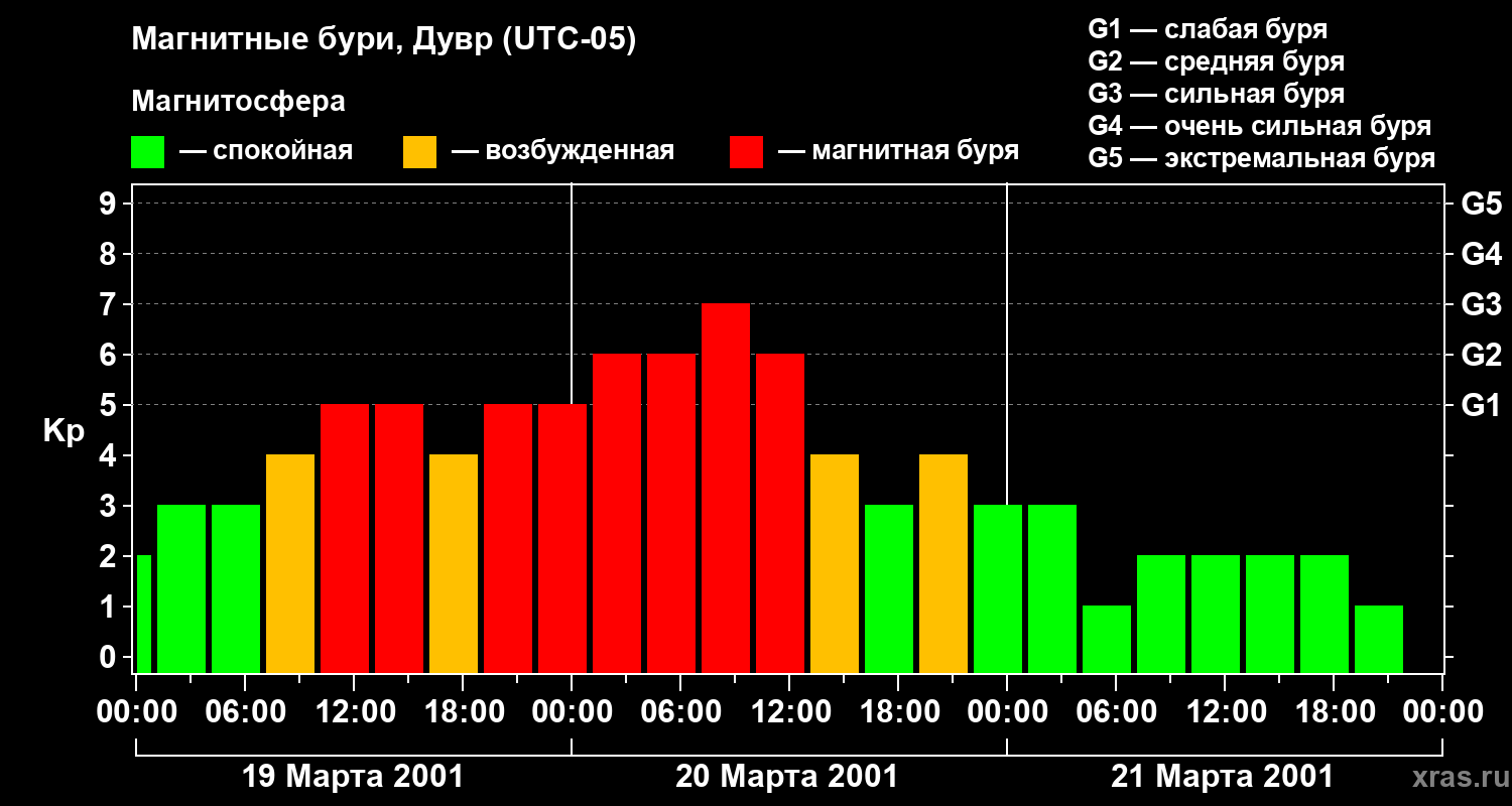 Изменения геомагнитного индекса Kp с 19 по 21 марта 2001 года для средних широт