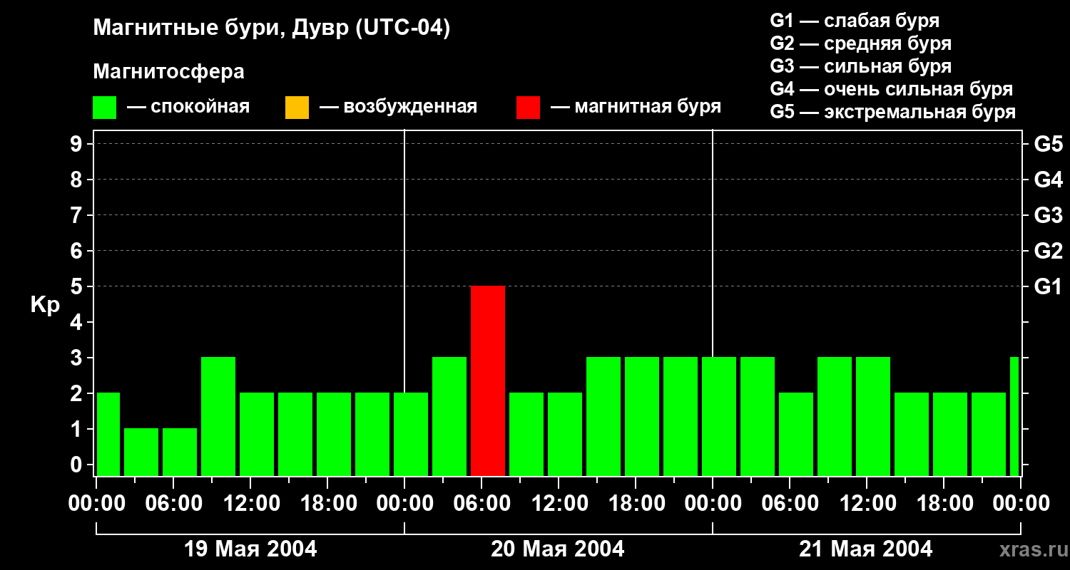 Изменения геомагнитного индекса Kp с 19 по 21 мая 2004 года для средних широт