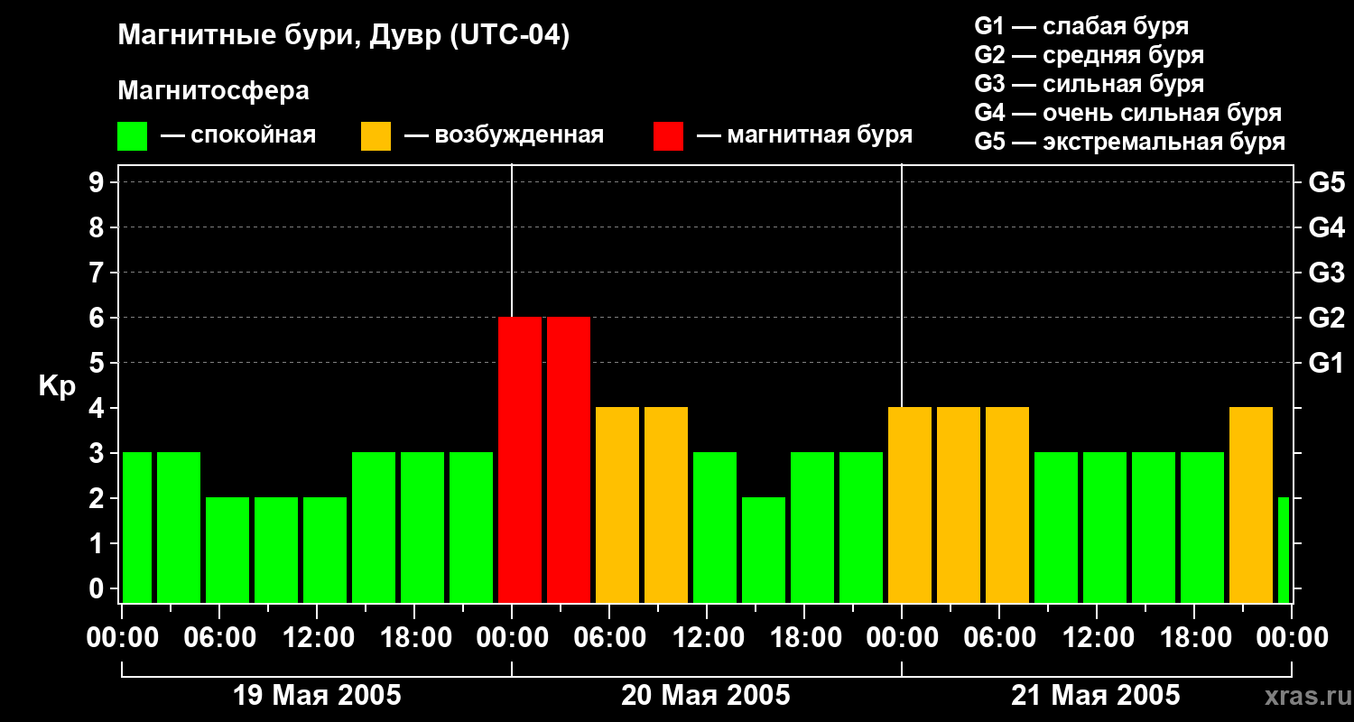Изменения геомагнитного индекса Kp с 19 по 21 мая 2005 года для средних широт