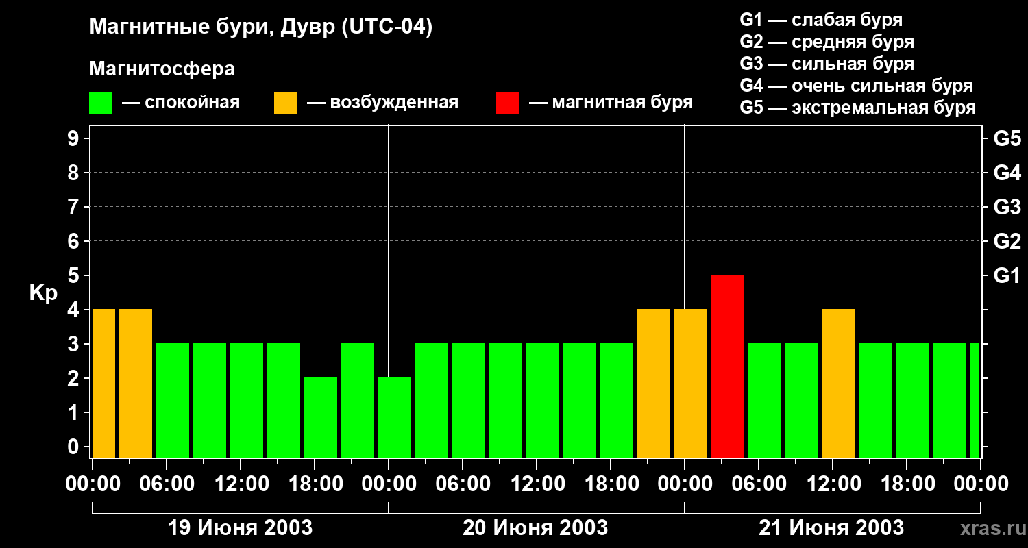 Изменения геомагнитного индекса Kp с 19 по 21 июня 2003 года для средних широт