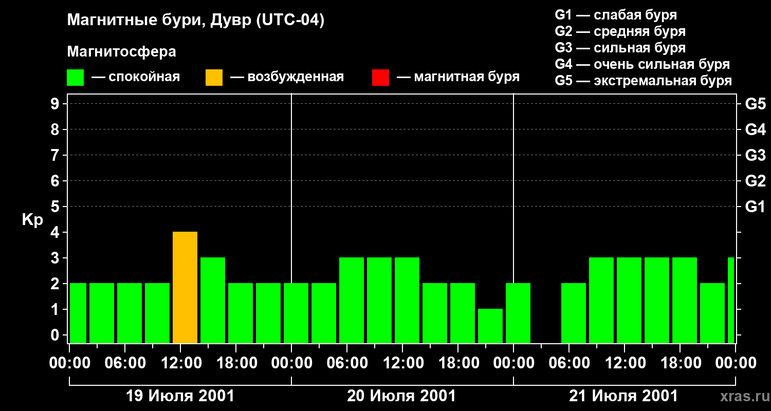 Изменения геомагнитного индекса Kp с 19 по 21 июля 2001 года для средних широт