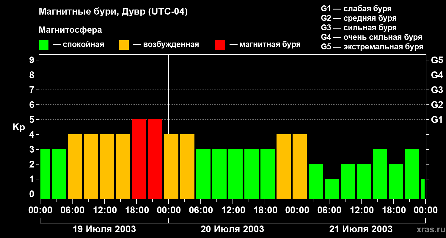 Изменения геомагнитного индекса Kp с 19 по 21 июля 2003 года для средних широт