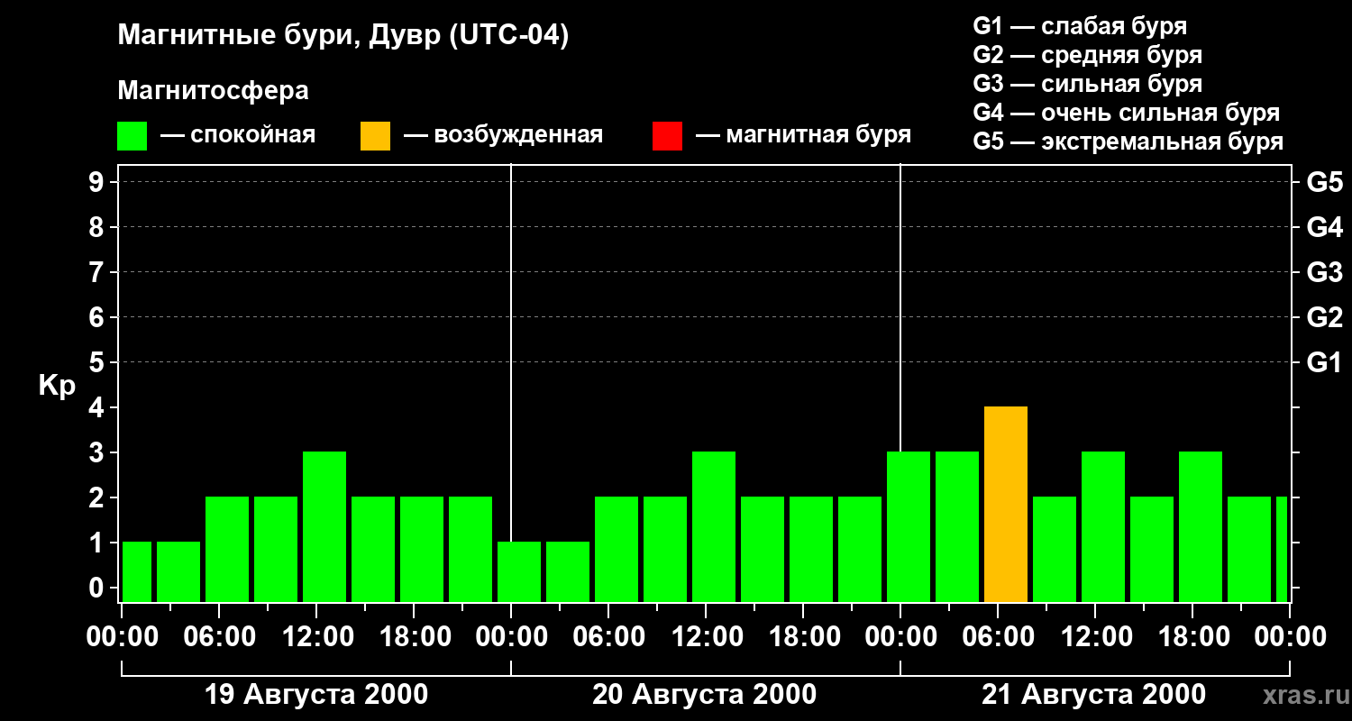 Изменения геомагнитного индекса Kp с 19 по 21 августа 2000 года для средних широт