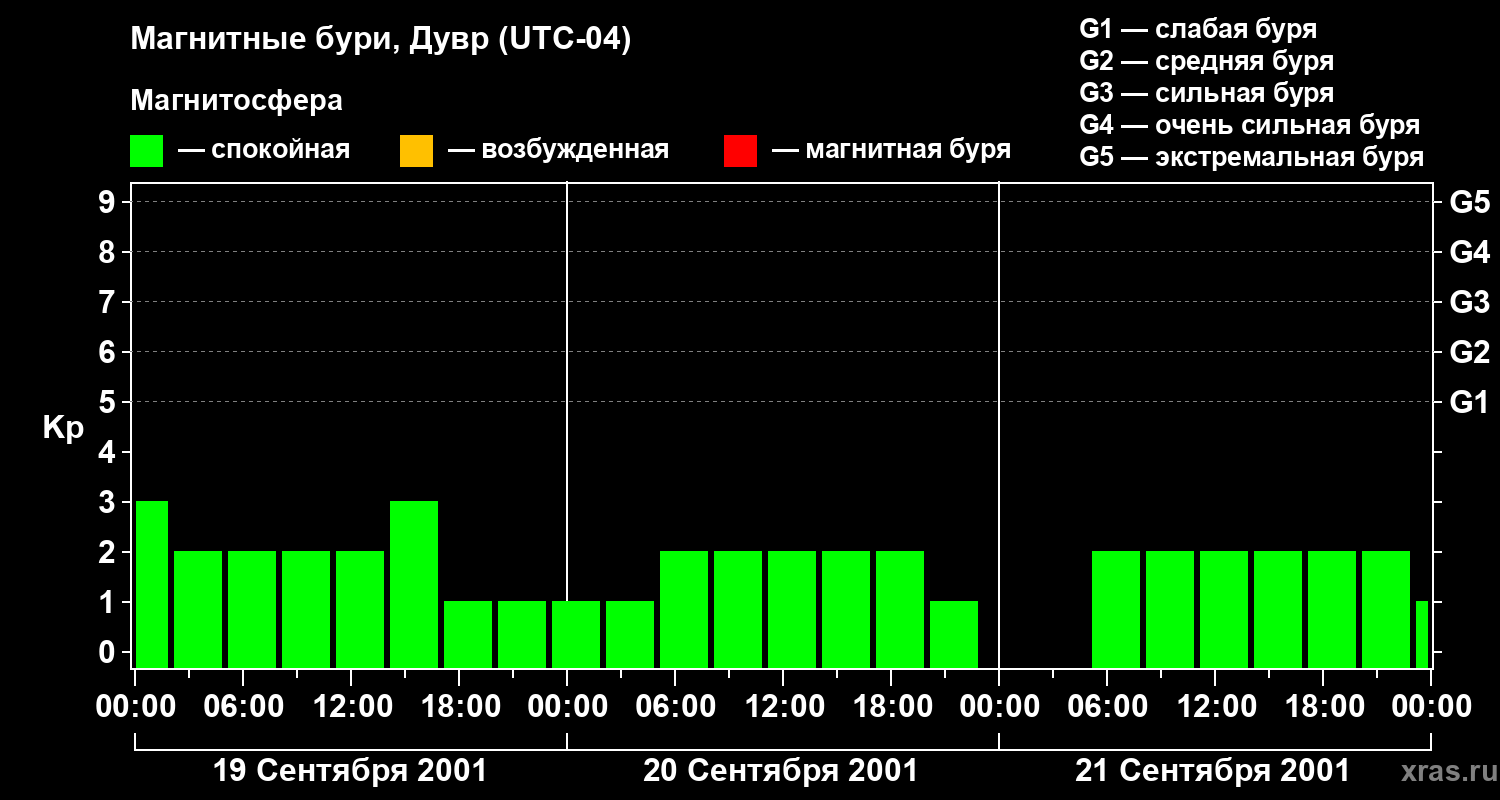 Изменения геомагнитного индекса Kp с 19 по 21 сентября 2001 года для средних широт