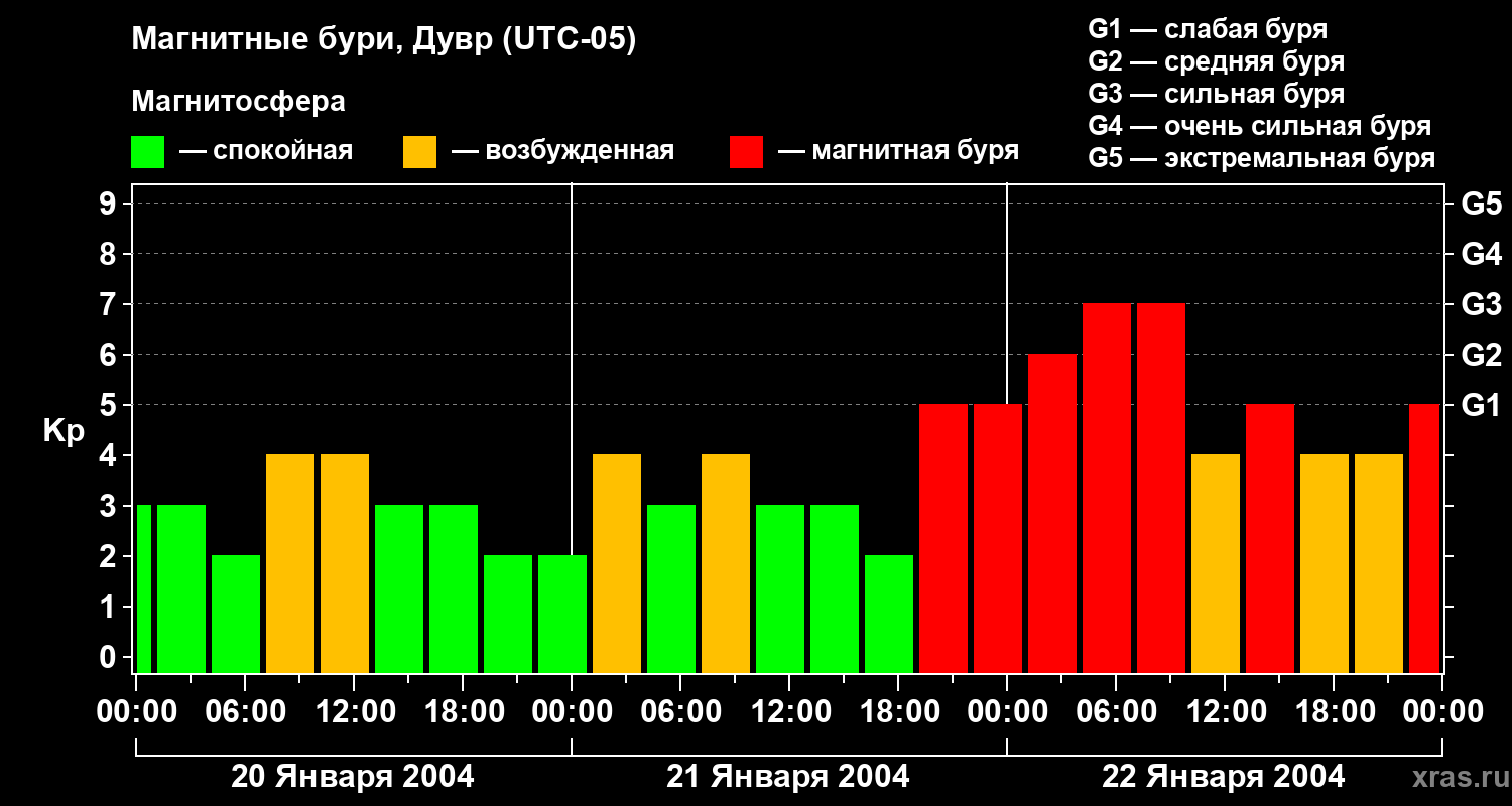 Изменения геомагнитного индекса Kp с 20 по 22 января 2004 года для средних широт