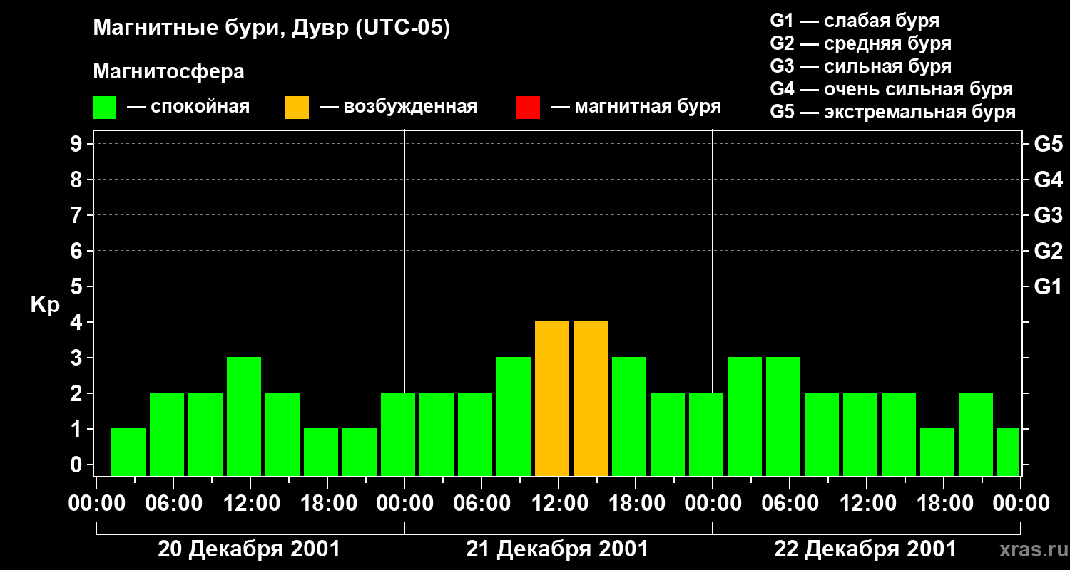 Изменения геомагнитного индекса Kp с 20 по 22 декабря 2001 года для средних широт