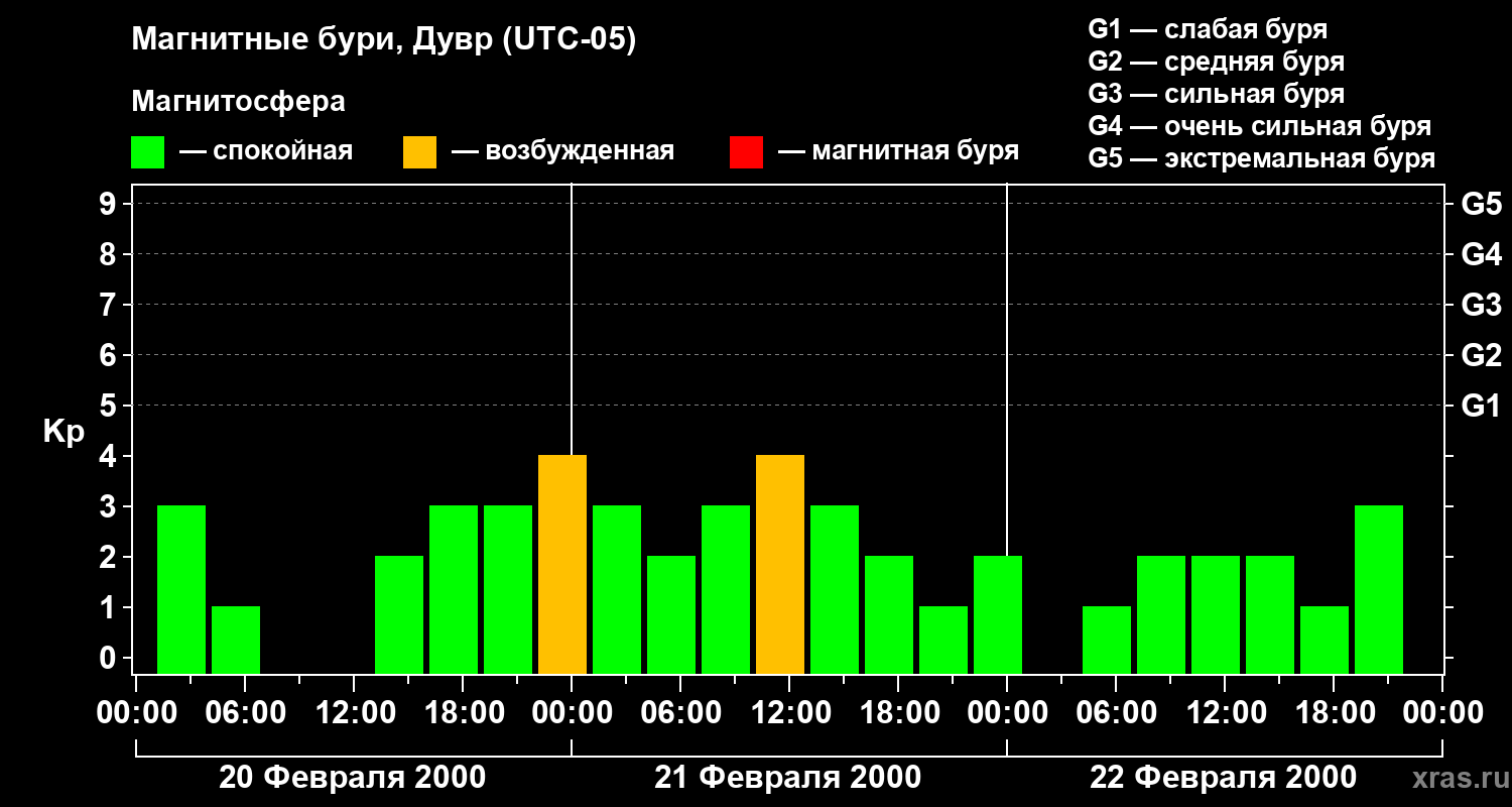 Изменения геомагнитного индекса Kp с 20 по 22 февраля 2000 года для средних широт
