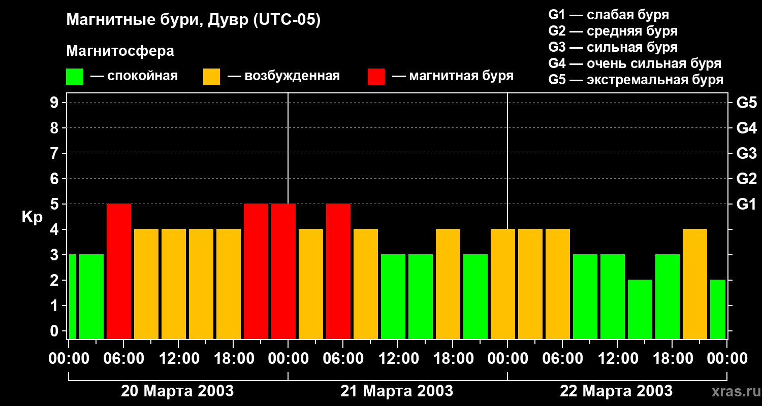 Изменения геомагнитного индекса Kp с 20 по 22 марта 2003 года для средних широт