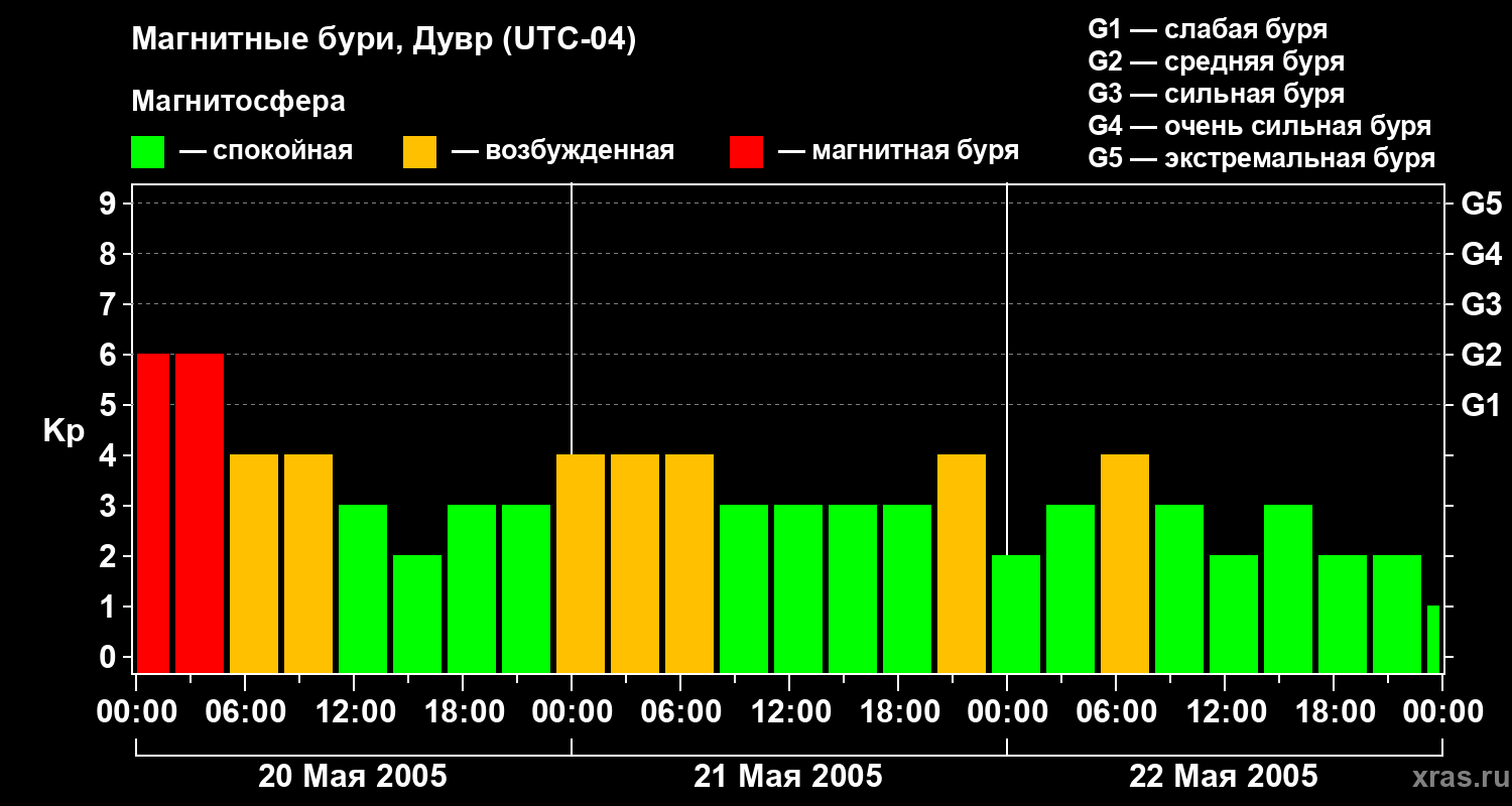 Изменения геомагнитного индекса Kp с 20 по 22 мая 2005 года для средних широт