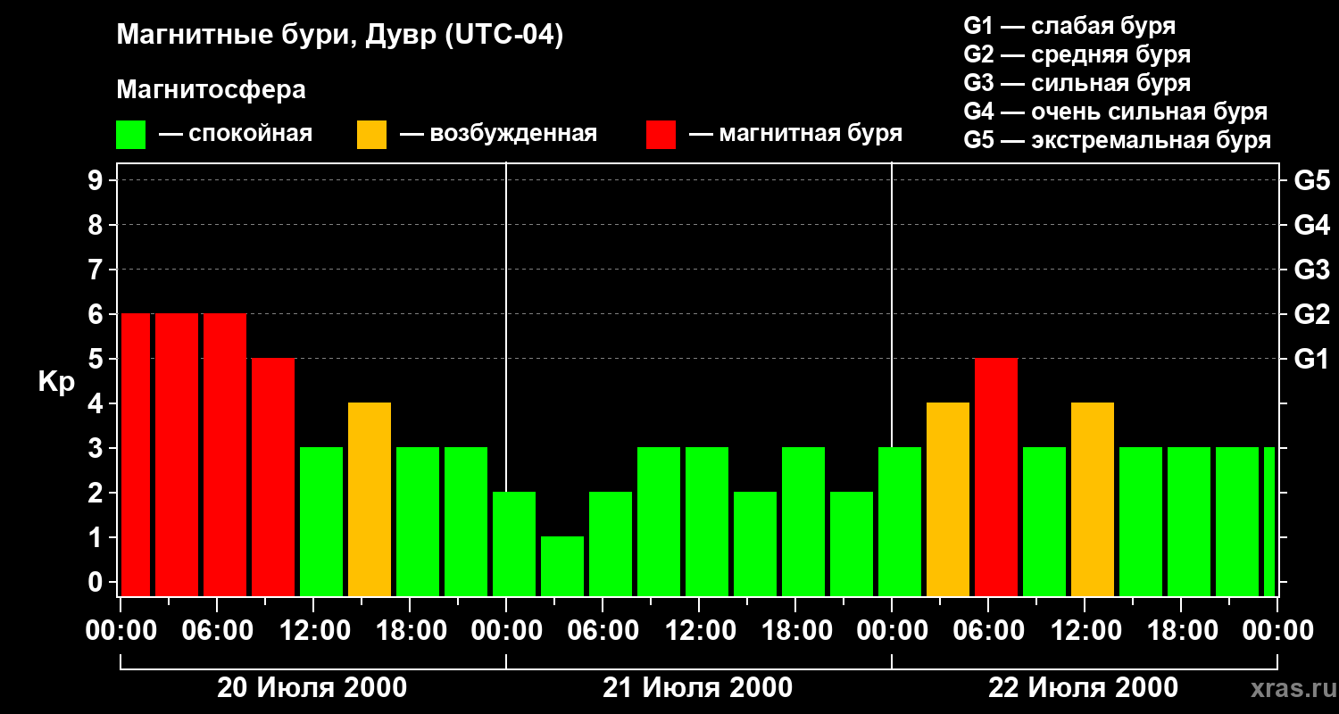 Изменения геомагнитного индекса Kp с 20 по 22 июля 2000 года для средних широт