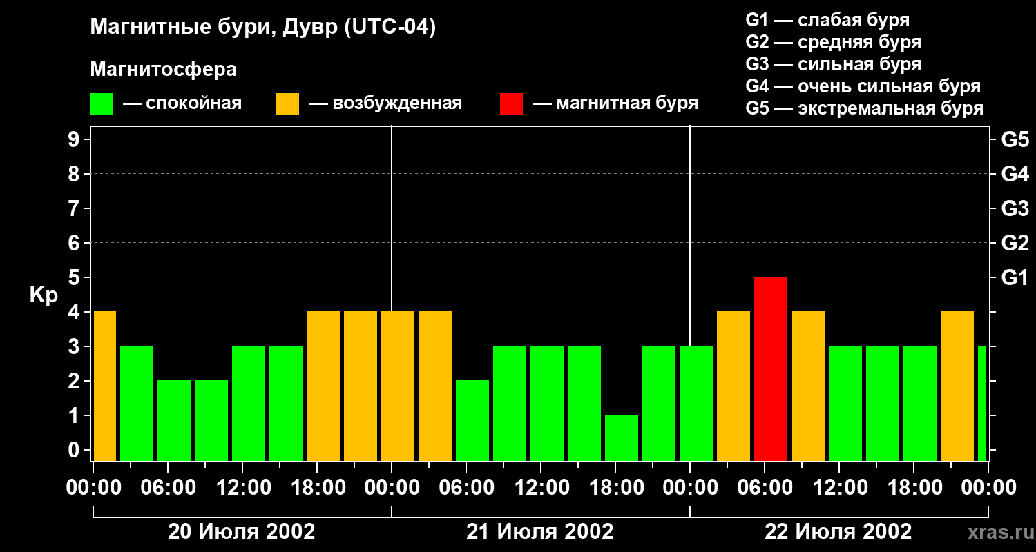 Изменения геомагнитного индекса Kp с 20 по 22 июля 2002 года для средних широт