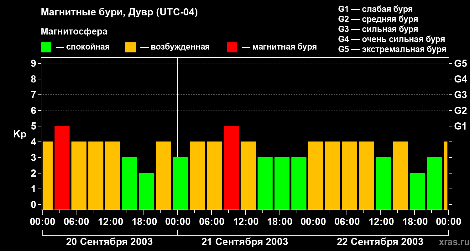 Изменения геомагнитного индекса Kp с 20 по 22 сентября 2003 года для средних широт