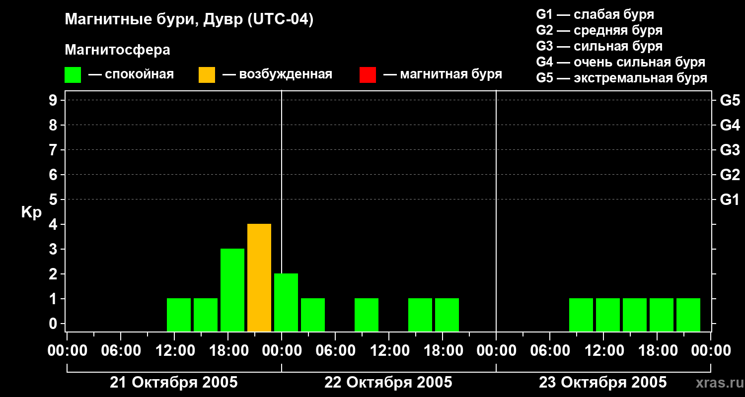 Изменения геомагнитного индекса Kp с 21 по 23 октября 2005 года для средних широт