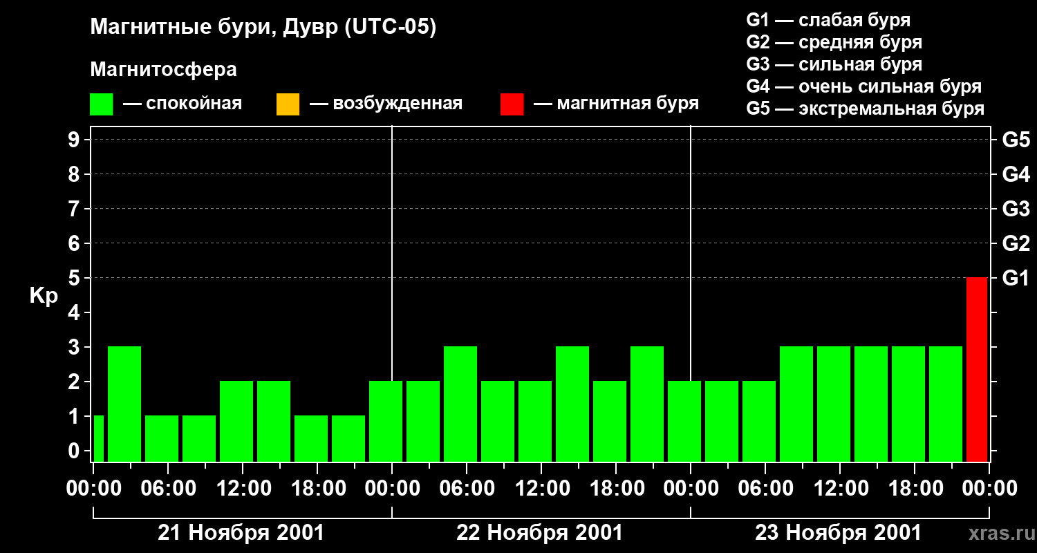 Изменения геомагнитного индекса Kp с 21 по 23 ноября 2001 года для средних широт