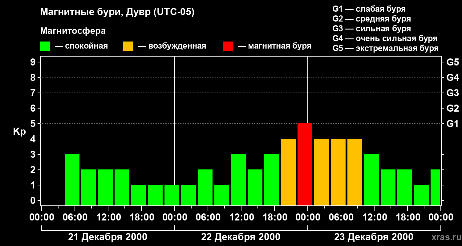 Изменения геомагнитного индекса Kp с 21 по 23 декабря 2000 года для средних широт