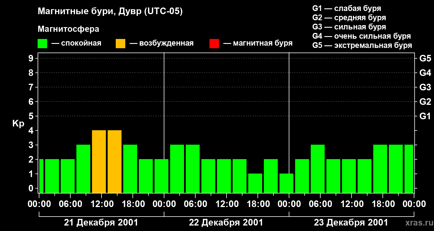 Изменения геомагнитного индекса Kp с 21 по 23 декабря 2001 года для средних широт