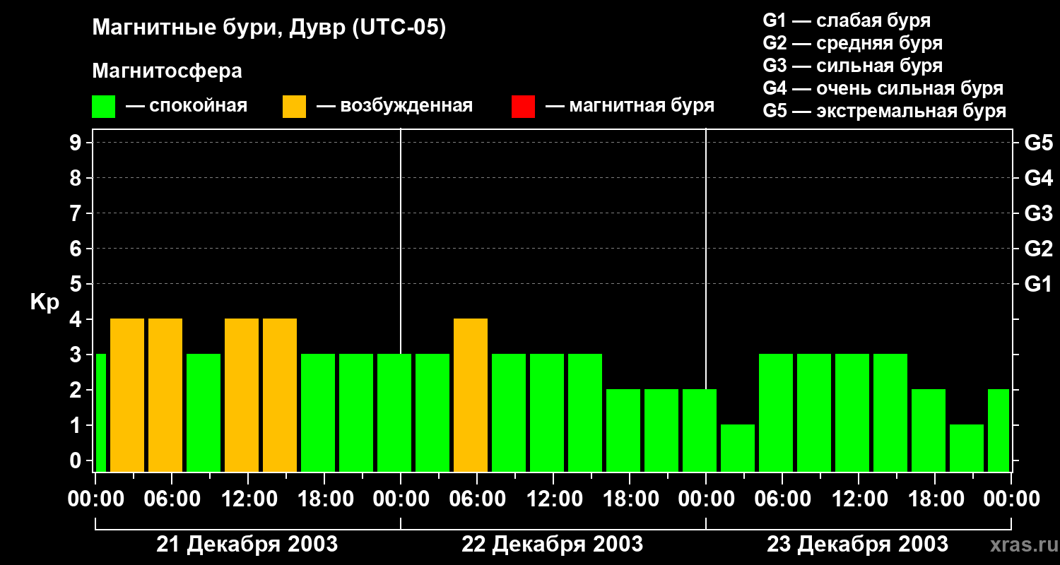 Изменения геомагнитного индекса Kp с 21 по 23 декабря 2003 года для средних широт