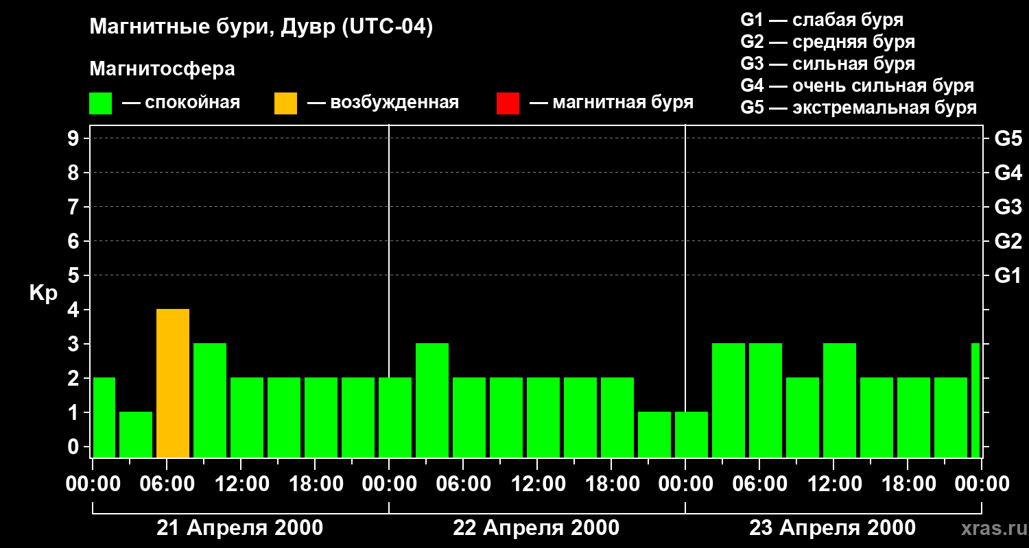 Изменения геомагнитного индекса Kp с 21 по 23 апреля 2000 года для средних широт