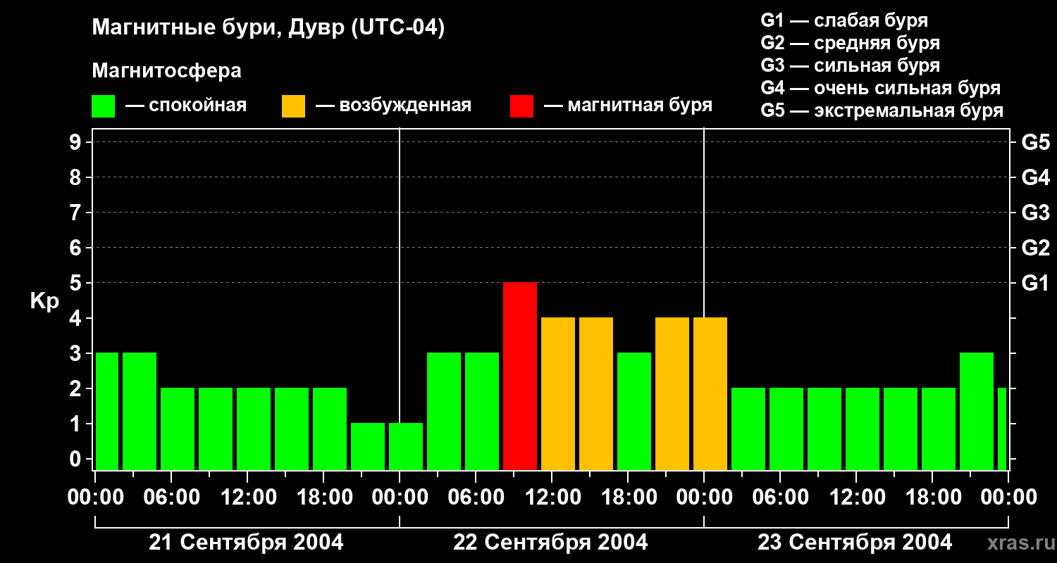 Изменения геомагнитного индекса Kp с 21 по 23 сентября 2004 года для средних широт