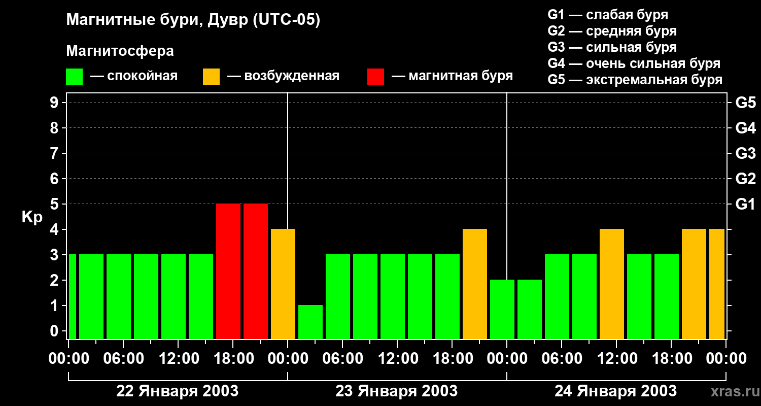 Изменения геомагнитного индекса Kp с 22 по 24 января 2003 года для средних широт