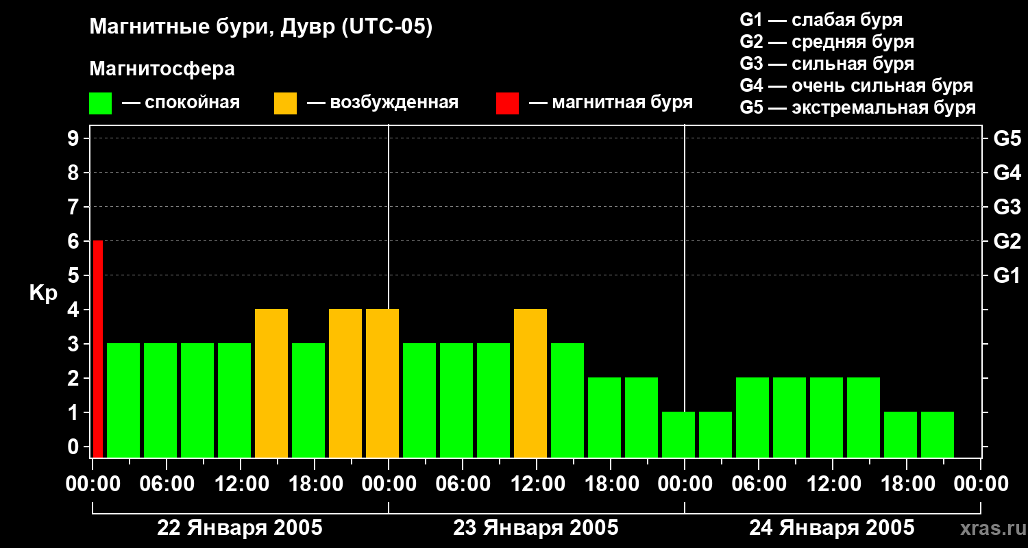 Изменения геомагнитного индекса Kp с 22 по 24 января 2005 года для средних широт