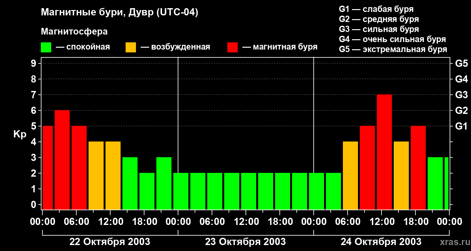 Изменения геомагнитного индекса Kp с 22 по 24 октября 2003 года для средних широт