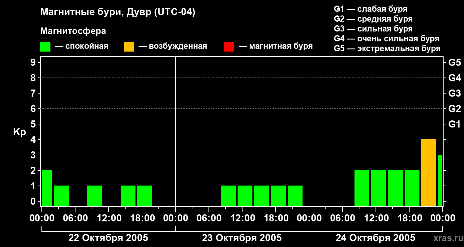 Изменения геомагнитного индекса Kp с 22 по 24 октября 2005 года для средних широт
