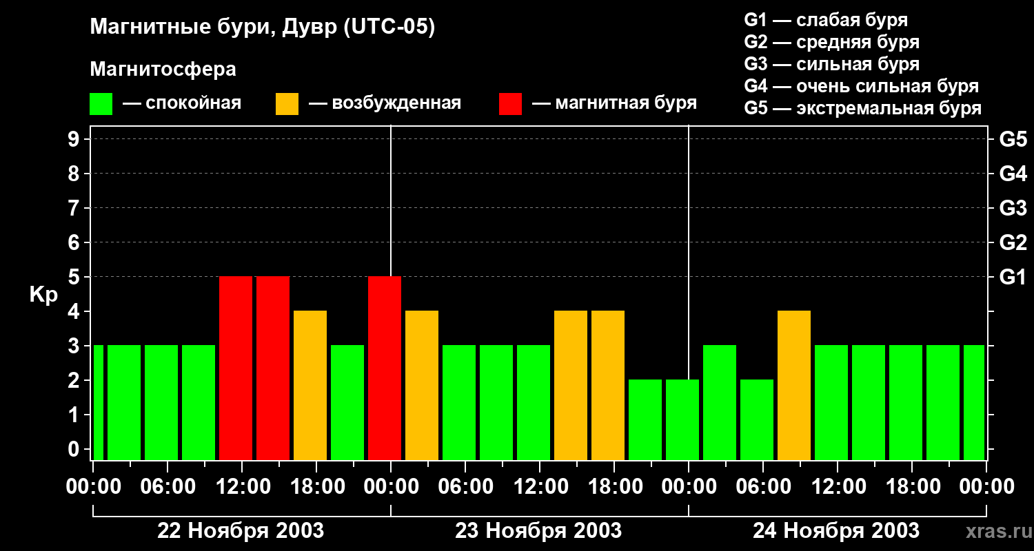 Изменения геомагнитного индекса Kp с 22 по 24 ноября 2003 года для средних широт