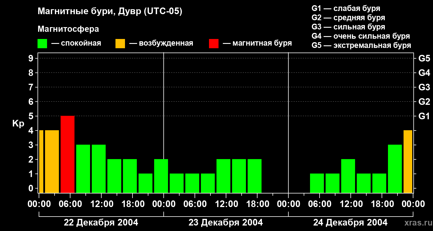 Изменения геомагнитного индекса Kp с 22 по 24 декабря 2004 года для средних широт
