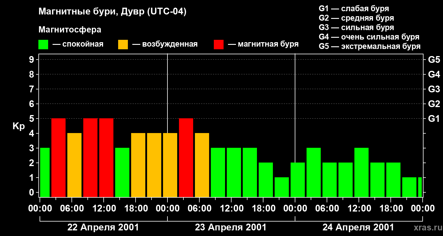 Изменения геомагнитного индекса Kp с 22 по 24 апреля 2001 года для средних широт