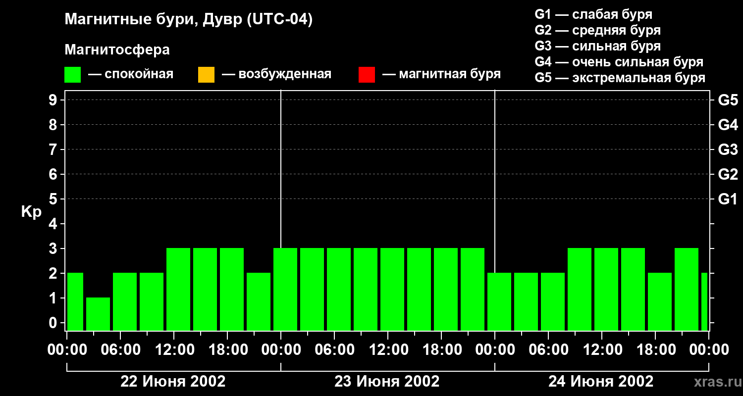 Изменения геомагнитного индекса Kp с 22 по 24 июня 2002 года для средних широт
