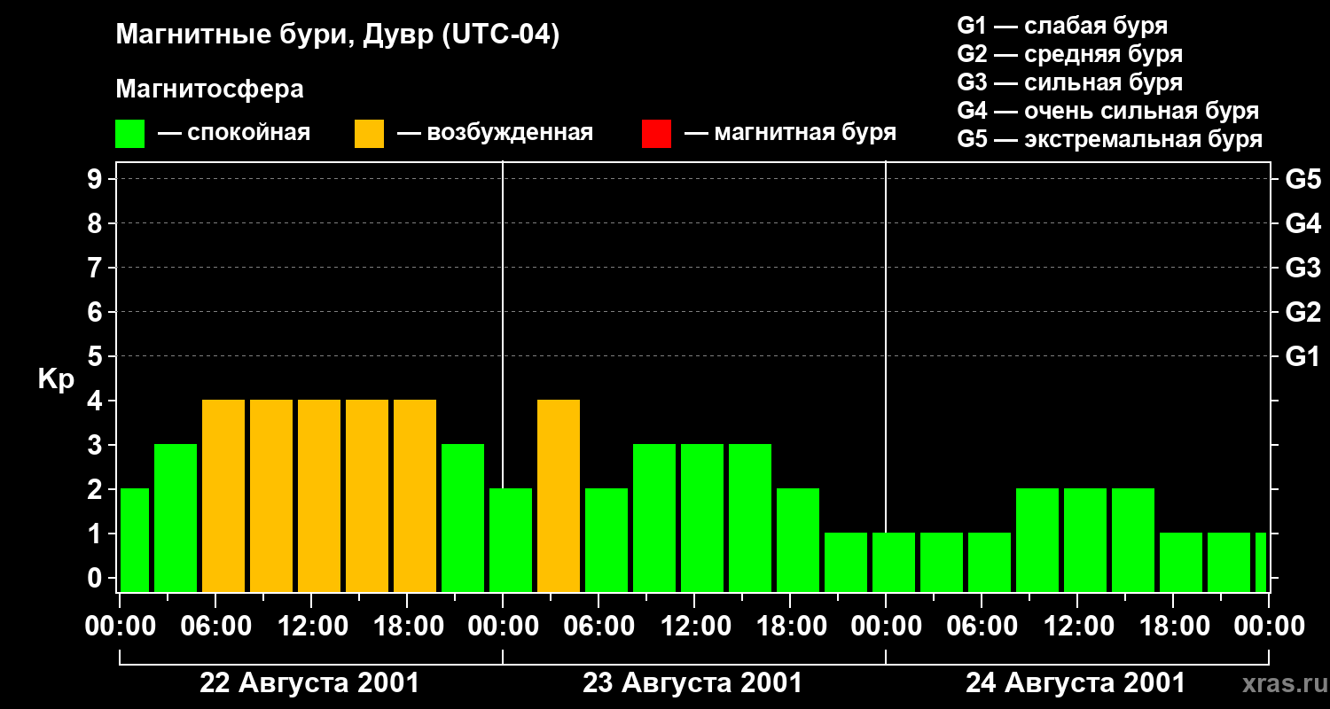 Изменения геомагнитного индекса Kp с 22 по 24 августа 2001 года для средних широт