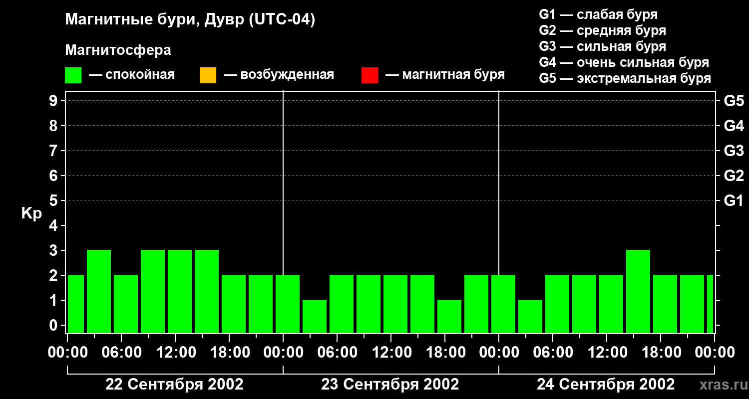 Изменения геомагнитного индекса Kp с 22 по 24 сентября 2002 года для средних широт