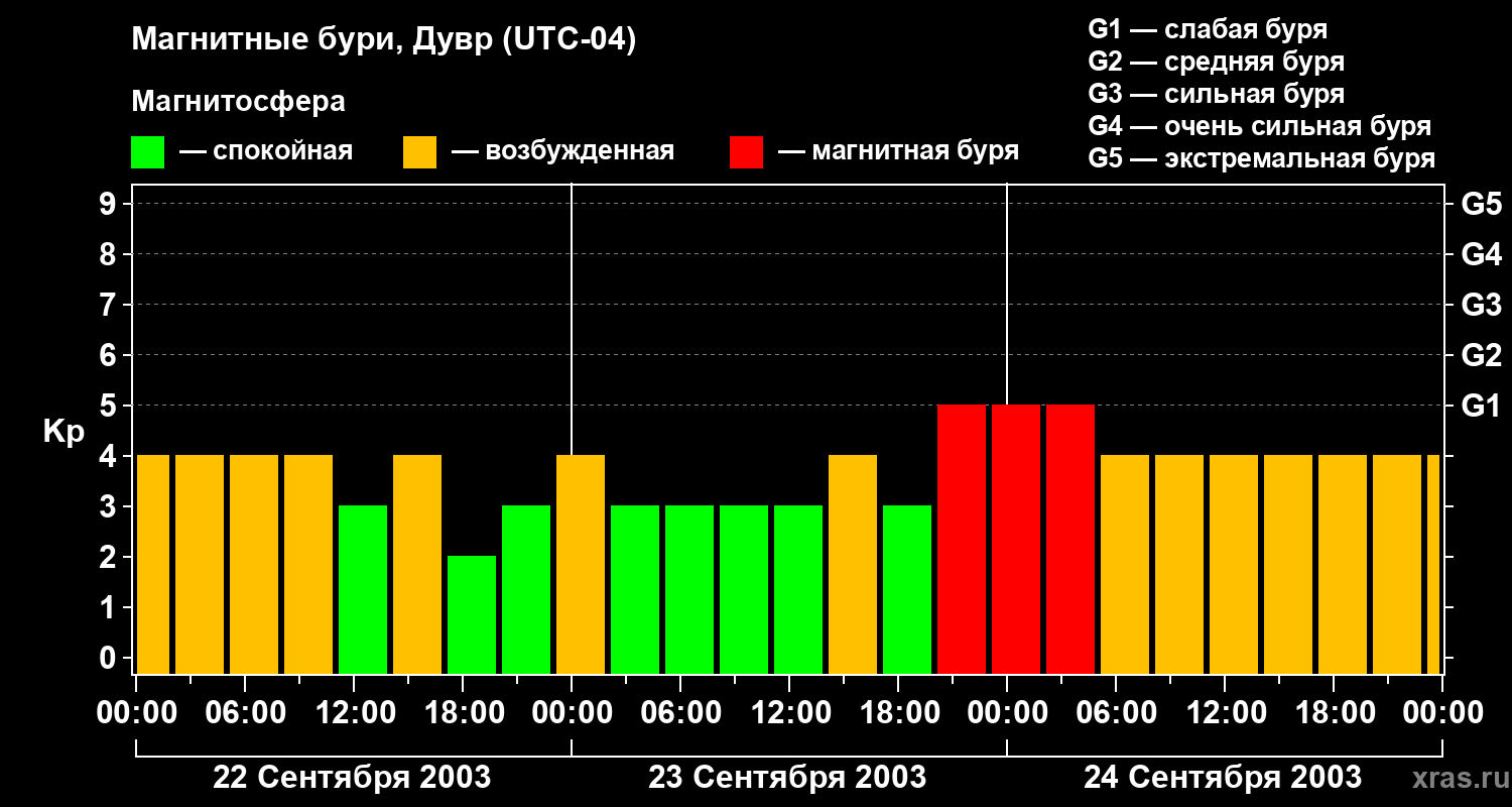 Изменения геомагнитного индекса Kp с 22 по 24 сентября 2003 года для средних широт