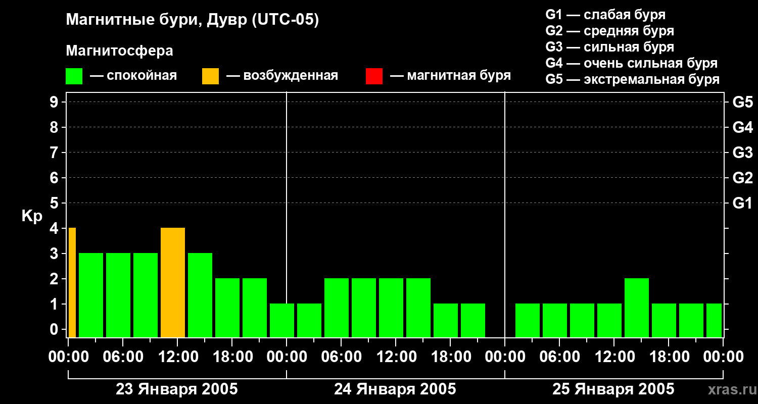 Изменения геомагнитного индекса Kp с 23 по 25 января 2005 года для средних широт