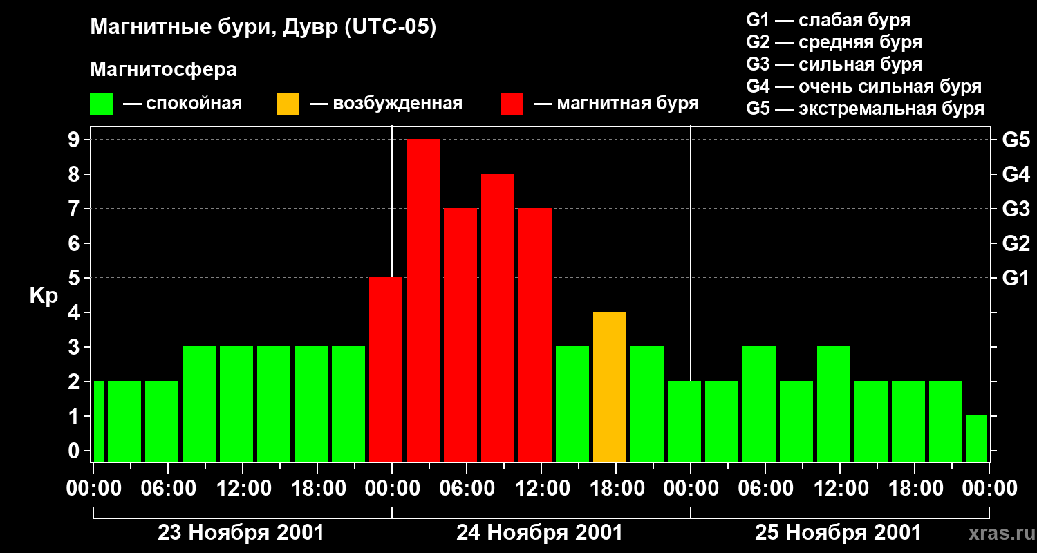 Изменения геомагнитного индекса Kp с 23 по 25 ноября 2001 года для средних широт