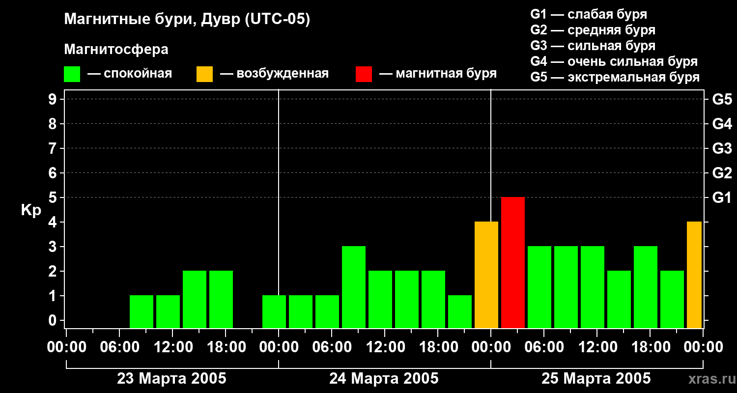 Изменения геомагнитного индекса Kp с 23 по 25 марта 2005 года для средних широт