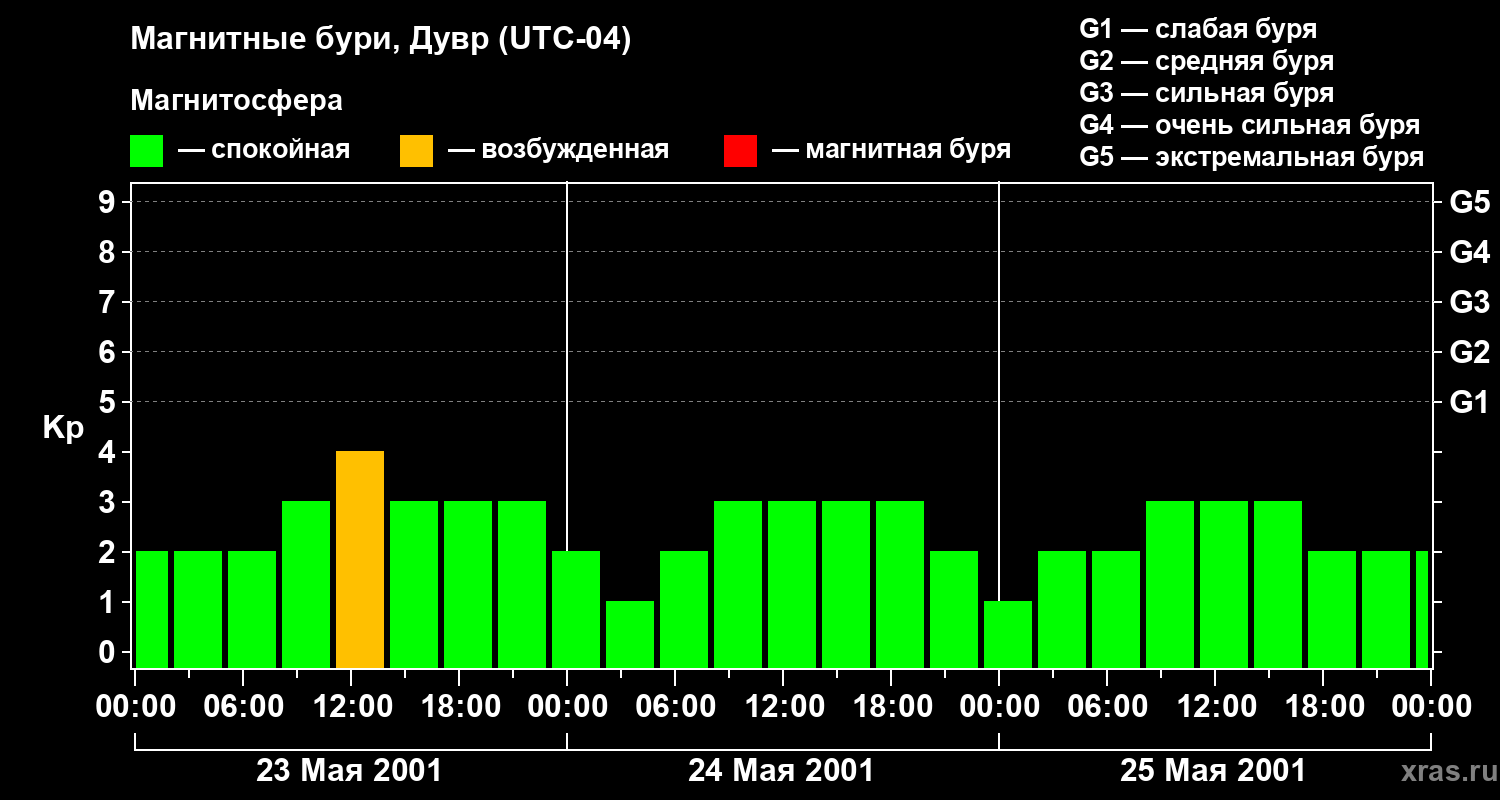 Изменения геомагнитного индекса Kp с 23 по 25 мая 2001 года для средних широт