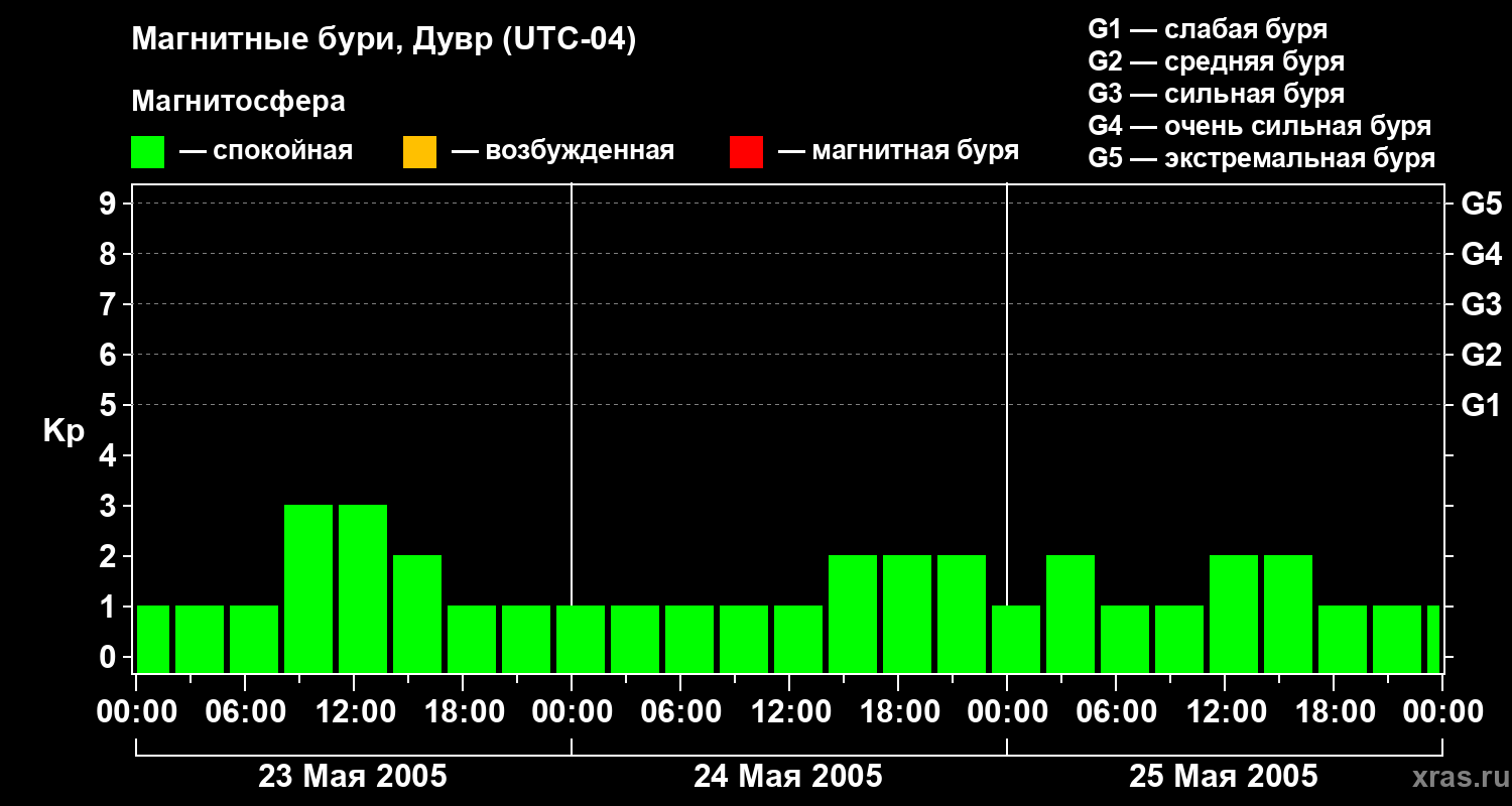 Изменения геомагнитного индекса Kp с 23 по 25 мая 2005 года для средних широт