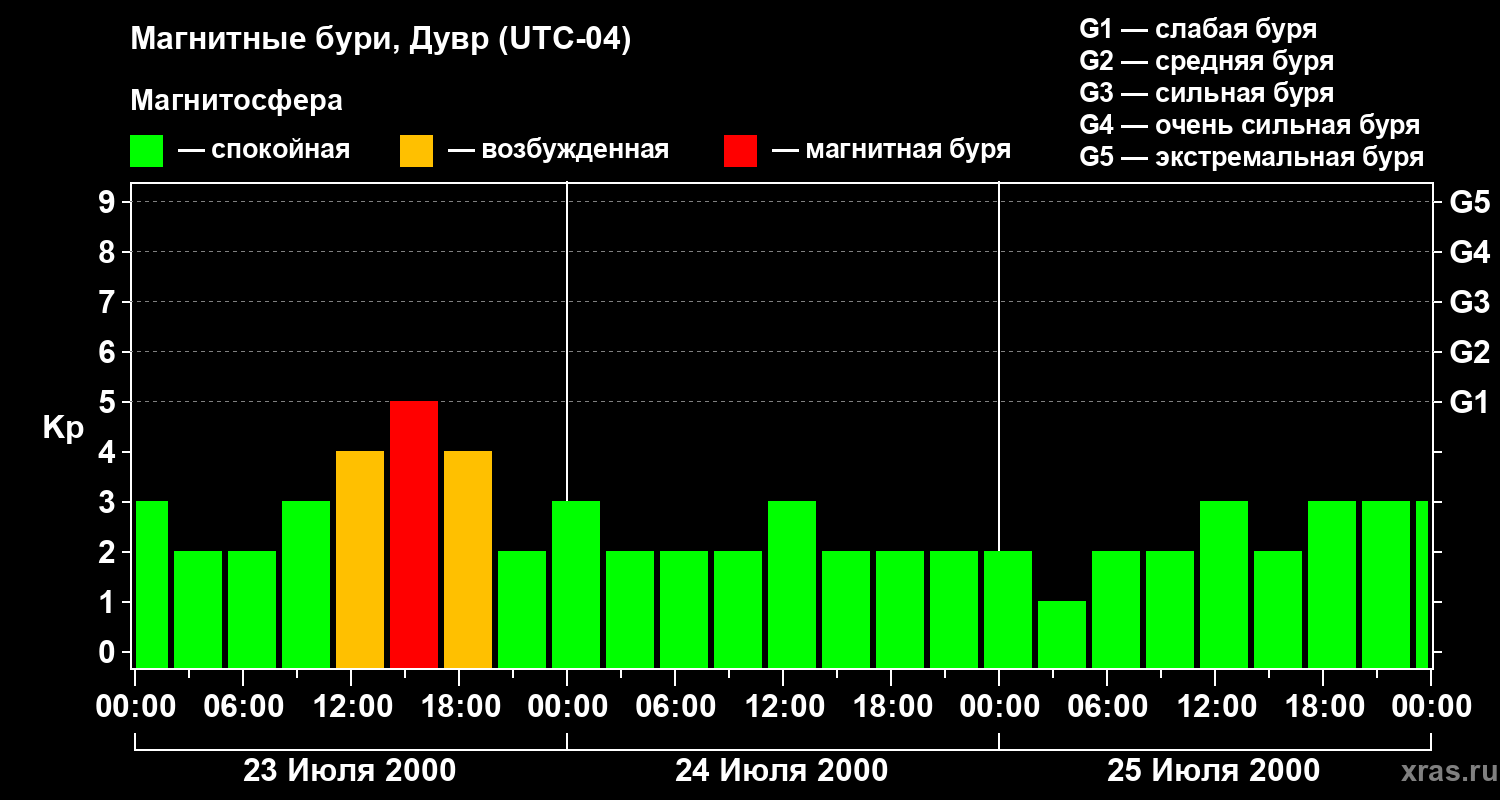 Изменения геомагнитного индекса Kp с 23 по 25 июля 2000 года для средних широт