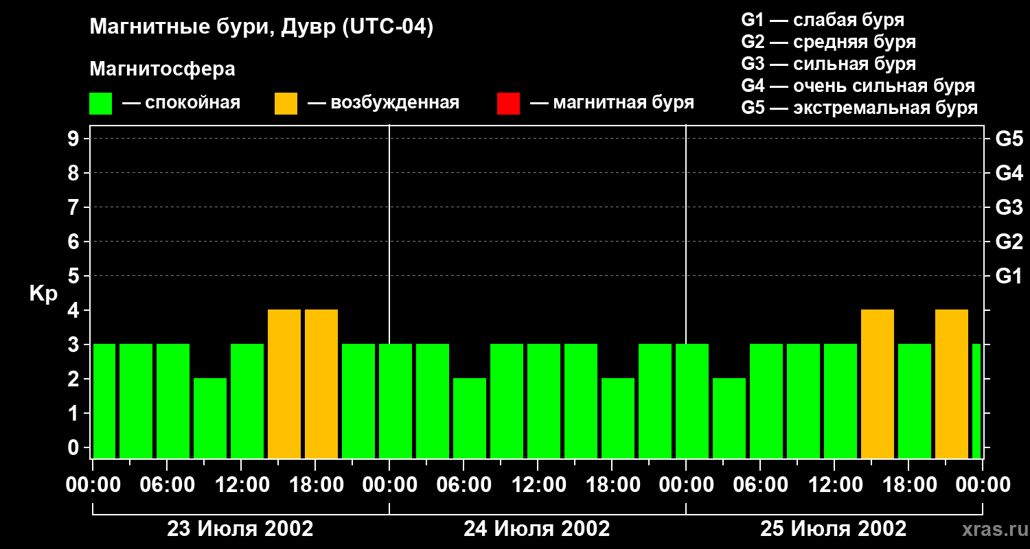 Изменения геомагнитного индекса Kp с 23 по 25 июля 2002 года для средних широт