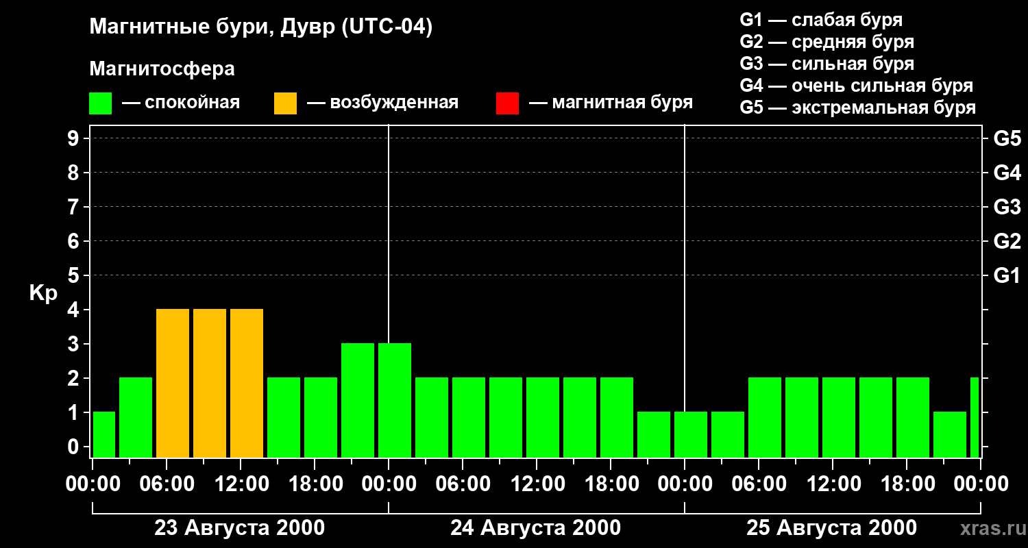 Изменения геомагнитного индекса Kp с 23 по 25 августа 2000 года для средних широт