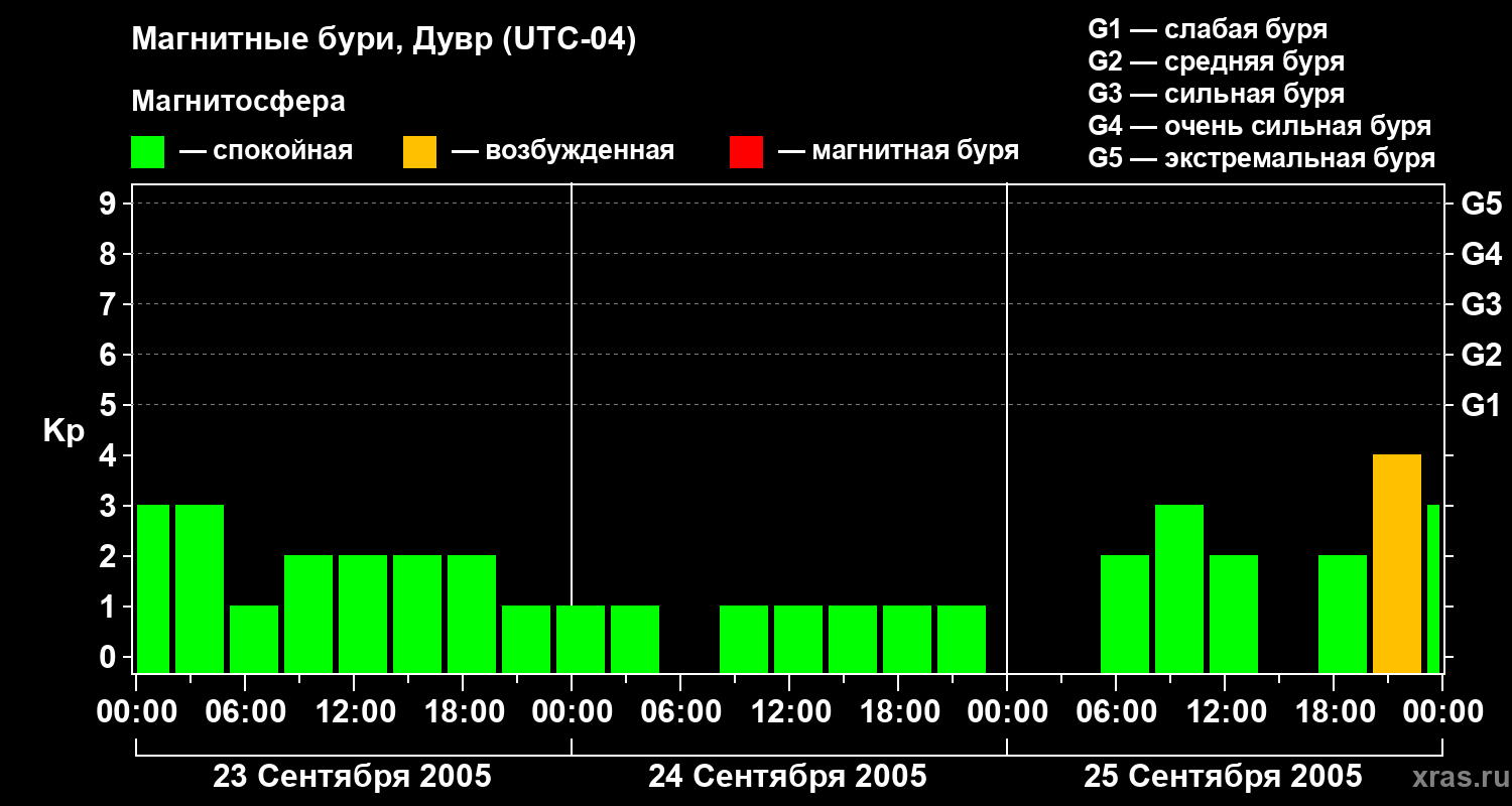 Изменения геомагнитного индекса Kp с 23 по 25 сентября 2005 года для средних широт